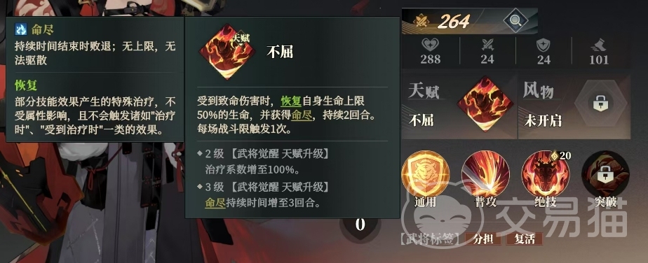 此外不屈天赋所附带的恢复效果属于特殊治疗机制,它不受角色属性的影响,并且不会触发诸如治疗时、受到治疗时等一系列相关效果,随着武将觉醒等级的提升,不屈天赋还会进一步强化,当达到2级武将觉醒天赋升级时,治疗系数将增至100%,这意味着周泰在触发不屈天赋时的恢复量会更加可观,而当达到3级武将觉醒天赋升级时,命尽状态的持续时间会延长至3回合。