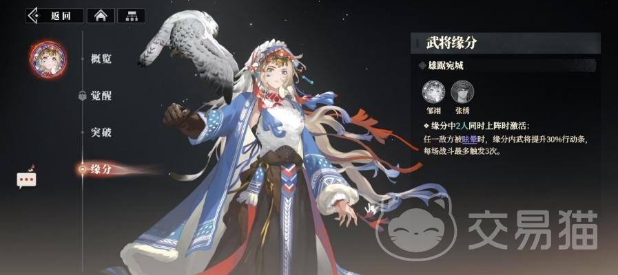 当然大家想要用好这个角色的话,其实邹翊也是有一些羁绊效果的,但是目前能够链接的角色不错,唯一的缘分就是她与张绣之间联系,共同激活名为雄踞宛城的缘分效果,当邹翊与张绣同时上阵时,这一缘分赋予了他们一种独特的能力,每当任一敌方被眩晕时,缘分内的武将便能瞬间提升30%的行动条,这种能力让他们在战斗中能够更快地出手,抢占先机,而且这种触发是有着充分保障的,每场战斗最多可触发3次,虽然次数不多,但是这个行动条增益带来的加成还是明显的,就是在数值上面后续要跟得上其他的输出才可以。