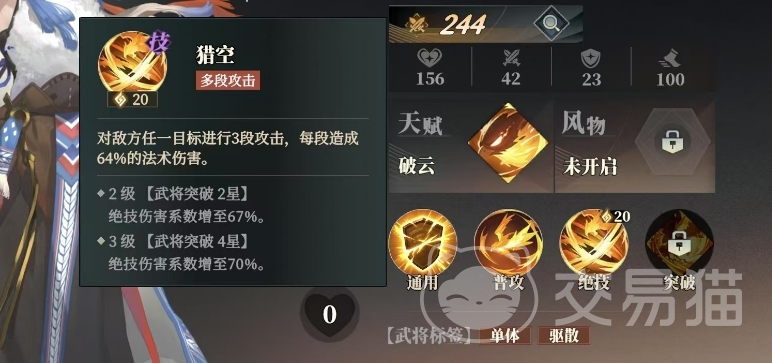 邹翊的普攻雕翎,当她发起攻击时,前排的敌方目标便将迎来一场85%法术伤害,此次攻击还附带了30%的暴击率,而她的绝技猎空,则是她真正的杀手锏,这一技能能够让她对敌方任一目标进行连续3段的猛烈攻击,每段都能造成64%的法术伤害,随着武将突破的深入,2星突破时这一绝技的伤害系数便能提升至67%,而4星突破时,更是达到了惊人的70%,使得她的攻击力更加恐怖。