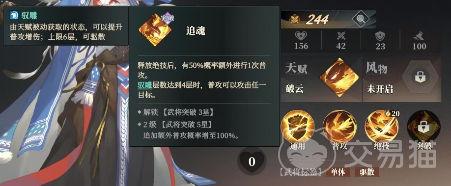 除了强大的主动技能外,邹翊还拥有一项独特的突破技能叫做追魂,每当她释放绝技后,便有50%的概率额外进行一次普攻,大家可以看成是一次追击技能的效果,而当她的驭雕层数累积到4层时,普攻更是可以无视敌方阵型,直接攻击任一目标,这种灵活性让她在战场上其实有很多种用法,驭雕的效果并非凭空而来,而是通过天赋被动获取的状态,它不仅能提升邹翊的普攻增伤,还能在达到上限6层时被驱散,值得一提的是当邹翊达到武将突破5星的时候,她的追加额外普攻概率将增至100%,这意味着她在战场上几乎可以每一个回合都有追击效果,每一次输出都是连接的两次。
