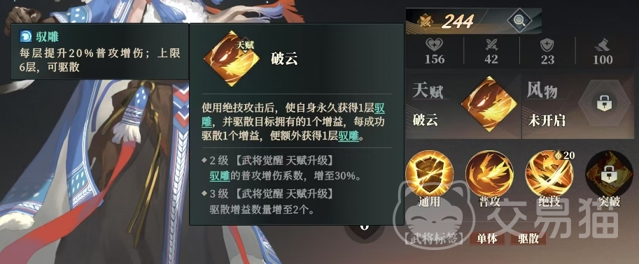 邹翊的天赋效果破云,每当她使用绝技攻击后,不仅会使自身永久获得1层珍贵的驭雕状态,还能精准地驱散目标所拥有的1个增益效果,这就是天赋触发 的效果,而更为巧妙的是,每成功驱散1个增益,她便能额外获得1层驭雕,这种设计使得她在战斗中能够迅速积累优势,每层驭雕都能提升她的普攻增伤,达到了20%的高额加成,且这一效果可以叠加至上限6层,当达到2级武将觉醒天赋升级时,驭雕的普攻增伤系数进一步提升至30%,而升级至3级时,她的驱散能力每次攻击能够驱散的增益数量增至2个。