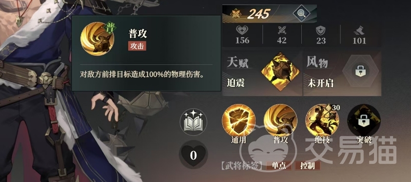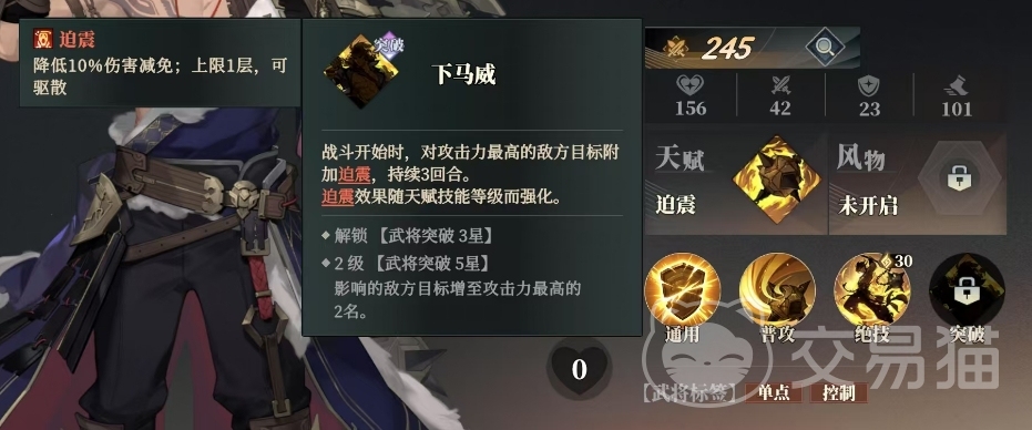 除了直接的伤害输出,张绣还拥有一项独特的突破技能叫做下马威,每当战斗开始时,他便会对敌方攻击力最高的目标施加迫震效果,持续3回合之久,这一效果不仅能有效降低敌方的伤害减免能力,还能根据张绣的天赋技能等级进行强化,最高可降低10%的伤害减免,且当张绣达到2级武将突破5星时,这一技能的影响范围还将扩大至敌方攻击力最高的两名目标。