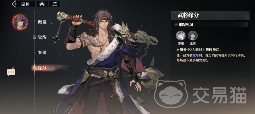 在武将缘分方面,张绣与邹翊共同激活了名为雄踞宛城的羁绊效果,这一效果极为独特,每当战场上有任一敌方被眩晕时无,论是张绣的天赋技能所致,还是其他控制效果,张绣与邹翊便能立即获得30%的行动条提升,使他们能够更频繁地出手控制战场节奏,而且这一效果每场战斗最多可触发3次,既保证了有一定的羁绊效果,又避免了过于频繁的触发导致游戏失衡。