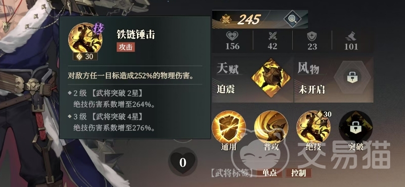 而他的绝技技能铁链锤击,则是其招牌技能,能够对敌方任意目标造成高达252%的物理伤害,展现出惊人的爆发力,随着武将等级的提升,这一技能的伤害系数还会进一步增加,当张绣达到2级武将突破2星时,绝技伤害系数将提升至264%,而3级武将突破4星时,更是达到了276%的数值,使他在战场上更加厉害。