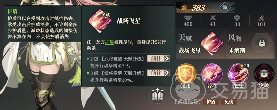 战场飞星这一天赋技能为张星彩增添了独特的战斗策略深度,其核心机制在于每当战场上有任一友方的护盾被敌人耗尽时,张星彩便能瞬间提升自身5%的行动条,使她能够更迅速地响应战局变化,调整位置或释放技能,为团队提供及时的支援或控制,随着武将觉醒的深入,这一天赋的效果也有一定的增强,达到2级武将觉醒天赋升级后,行动条的增加值提升至7%,而3级觉醒时,更是跃升至10%,也强化了张星彩在战场上的用处。