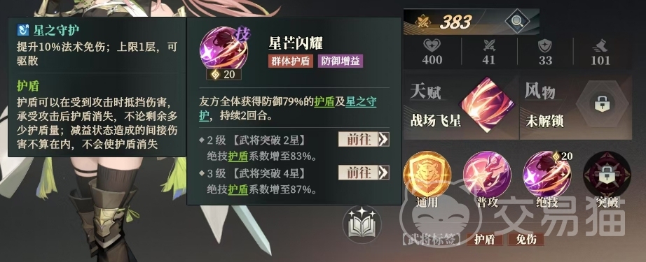 而她的绝技星芒闪耀,则更是群体护盾与防御增益的完美结合,释放这一技能时,友方全体将获得高达79%防御力的护盾,并附带星之守护效果,持续两回合,星之守护效果不仅能提升10%的法术免伤,而且上限为1层,可通过驱散效果去除,随着武将突破的提升,这一技能的护盾系数还会进一步增加,在2级武将突破2星时,护盾系数增至83%,而在3级武将突破4星时,更是达到了87%的高水平。
