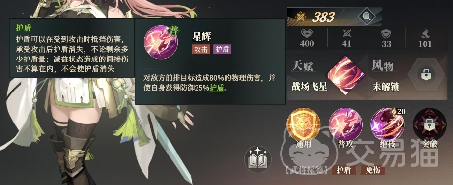 除了以上两个技能外,张星彩还拥有独特的突破技能繁星的祝福,当她达到3星突破时,这一技能便会解锁,每当战斗开始时,她便能为友方全体提供一个相当于防御力62%的护盾,为队友们筑起一道坚固的防线,这个护盾在受到攻击时能够有效抵挡伤害,并且在承受攻击后消失,无论剩余多少护盾量,值得注意的是,减益状态造成的间接伤害并不算在内,因此不会使护盾消失。而在2级武将突破5星时,这一技能的护盾系数还能进一步提升至防御力89%,此时的防御提升才算是比较高的。