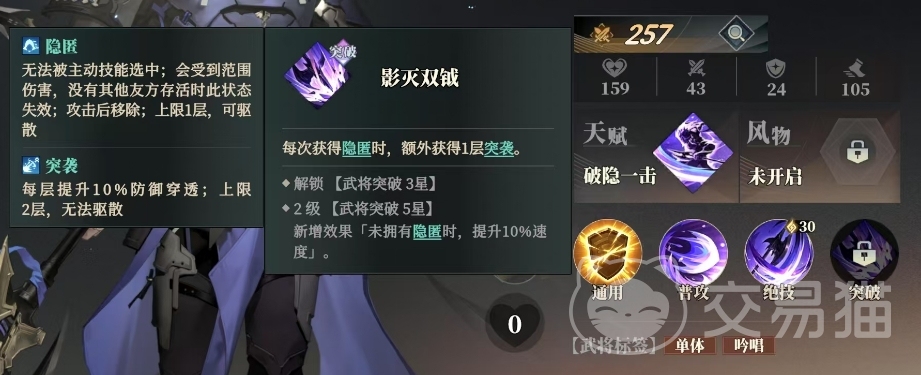 除了绝技外,张辽还拥有独特的突破技能影灭双钺,每次获得隐匿状态时,他都能额外获得1层突袭效果,这里的隐匿状态颇为特殊,它无法被主动技能选中,意味着敌人无法轻易通过技能来打破张辽的隐匿,但同时它会在受到范围伤害或没有其他友方存活时失效,且在攻击后移除,此状态上限为1层,并可被驱散,而突袭效果则能每层提升10%的防御穿透,上限为2层,且无法驱散,这一技能在武将突破3星时解锁,并在升级到2级武将突破5星后新增额外效果,未拥有隐匿时,也能提升10%的速度,使得张辽在战场上更加灵活。