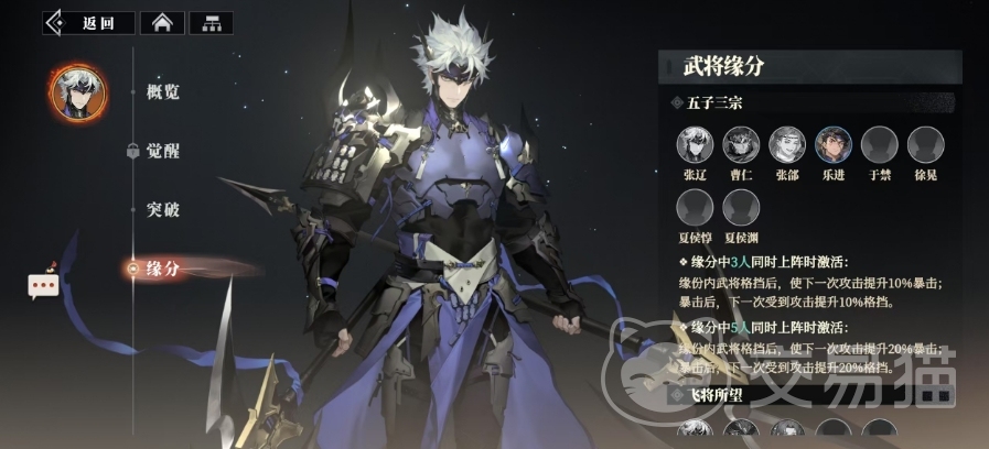 除了强大的天赋技能外,张辽还拥有丰富的武将缘分羁绊效果,其中五子三宗缘分是他的重要羁绊之一,当缘分中的3人同时上阵时,缘份内武将格挡后,下一次攻击会有10%的几率产生暴击,而暴击发生后,下一次受到攻击时也会有10%的几率成功格挡,若缘分中的5人同时上阵,这些效果则会进一步加强,格挡后的攻击提升至20%暴击率,暴击后的防御也提升至20%的格挡几率,这个羁绊关联着多位强力武将,如曹仁、张邰、乐进、于禁、徐晃、夏侯惇以及夏侯渊等。
