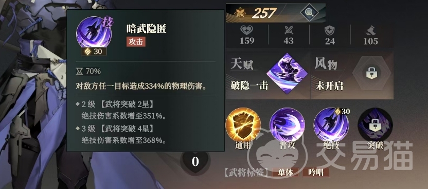 张辽的普攻冲阵效果相对一般,仅能对敌方前排目标造成100%的物理伤害,而绝技暗武隐匿则是他的一大杀器,能够对敌方任一目标造成高达334%的物理伤害,随着武将突破,这一技能的伤害系数还会进一步提升,2级武将突破2星时,绝技伤害系数可增至351%,3级武将突破4星时,更能增至368%。