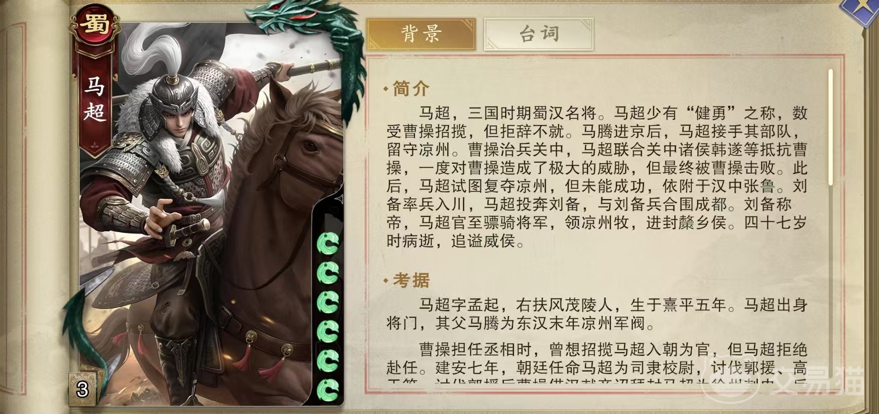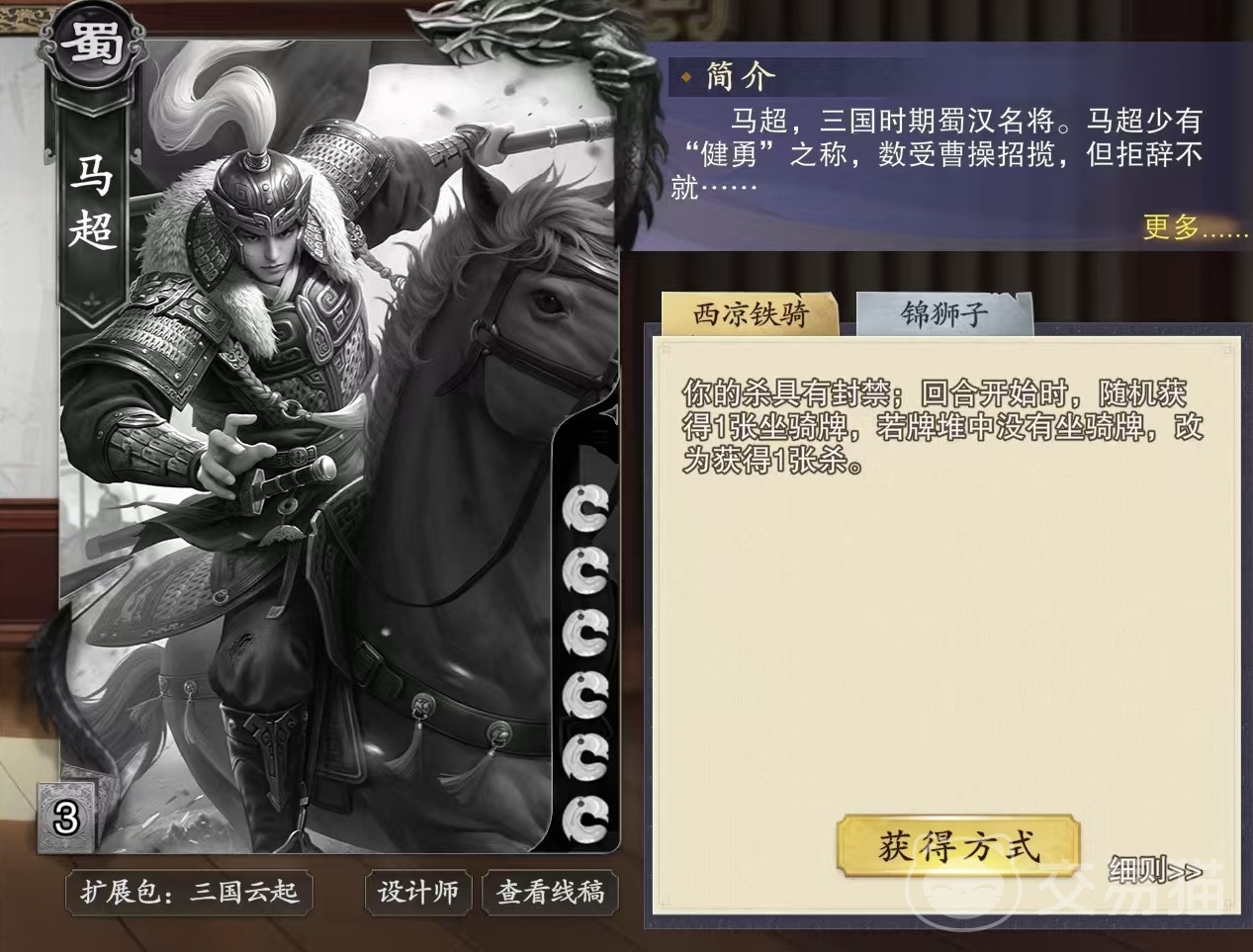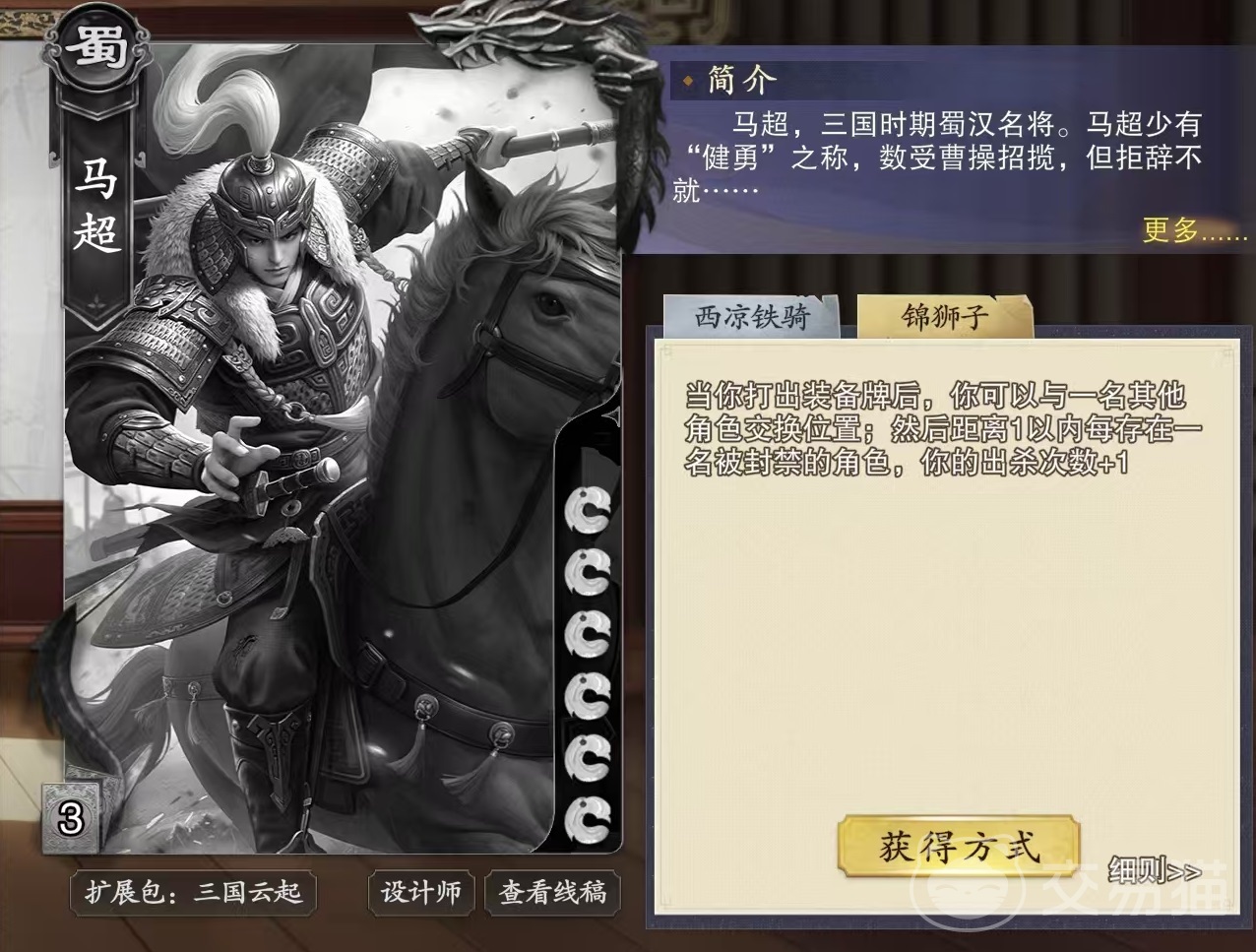 马超是属于蜀国阵营,他初始体力值比较高,一共有6点,具备两个技能,分别是西凉铁骑和锦狮子。第1个西凉铁骑,使马超的杀沙有封禁效果,回合开始时随机获得一张坐骑牌,如果牌堆中没有坐骑牌,那么改为获得一张杀。锦狮子的效果是当马超打出装备牌后,可以与一名其他角色交换位置,然后距离1以内每存在一名被封禁角色,本局可以出杀次数增加1次。