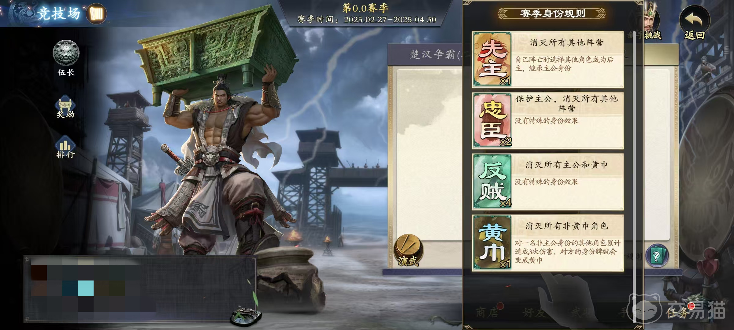 第3个是反贼,反贼目标是将所有主公和黄巾阵营目标都消灭掉,没有特殊身份效果。第4个是黄巾,这个身份非常有特点,对一个非主公身份的其他角色累计造成三次伤害,对方身份就会变成黄巾,黄巾的目标是消灭所有非黄巾的角色。这样的身份设定就使得场上多了更多的乐趣和随机性,不再是一成不变的身份,而是有了更多变数。在竞技场的八人局中,分别是一张先主,两张忠臣,四张反贼和一张黄巾。