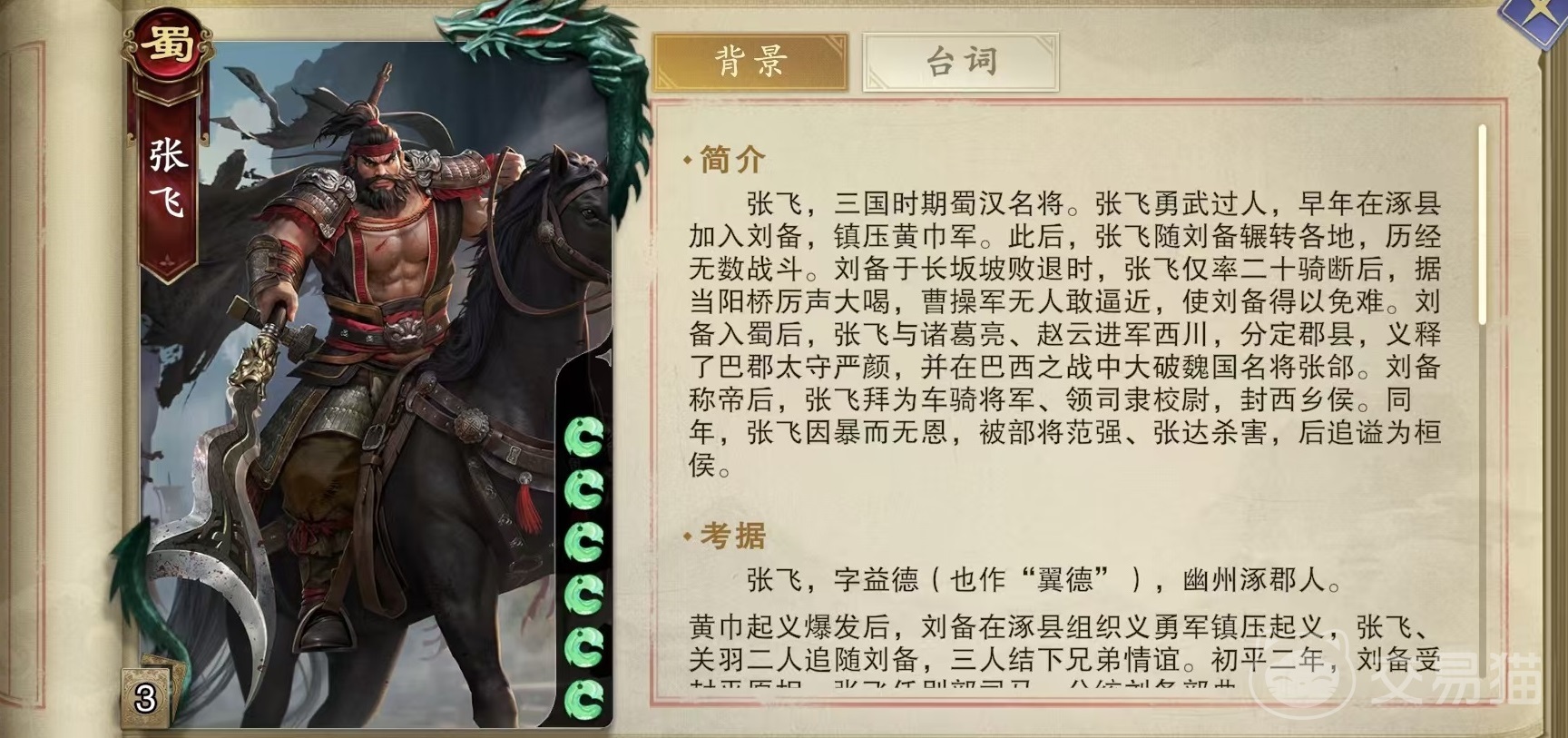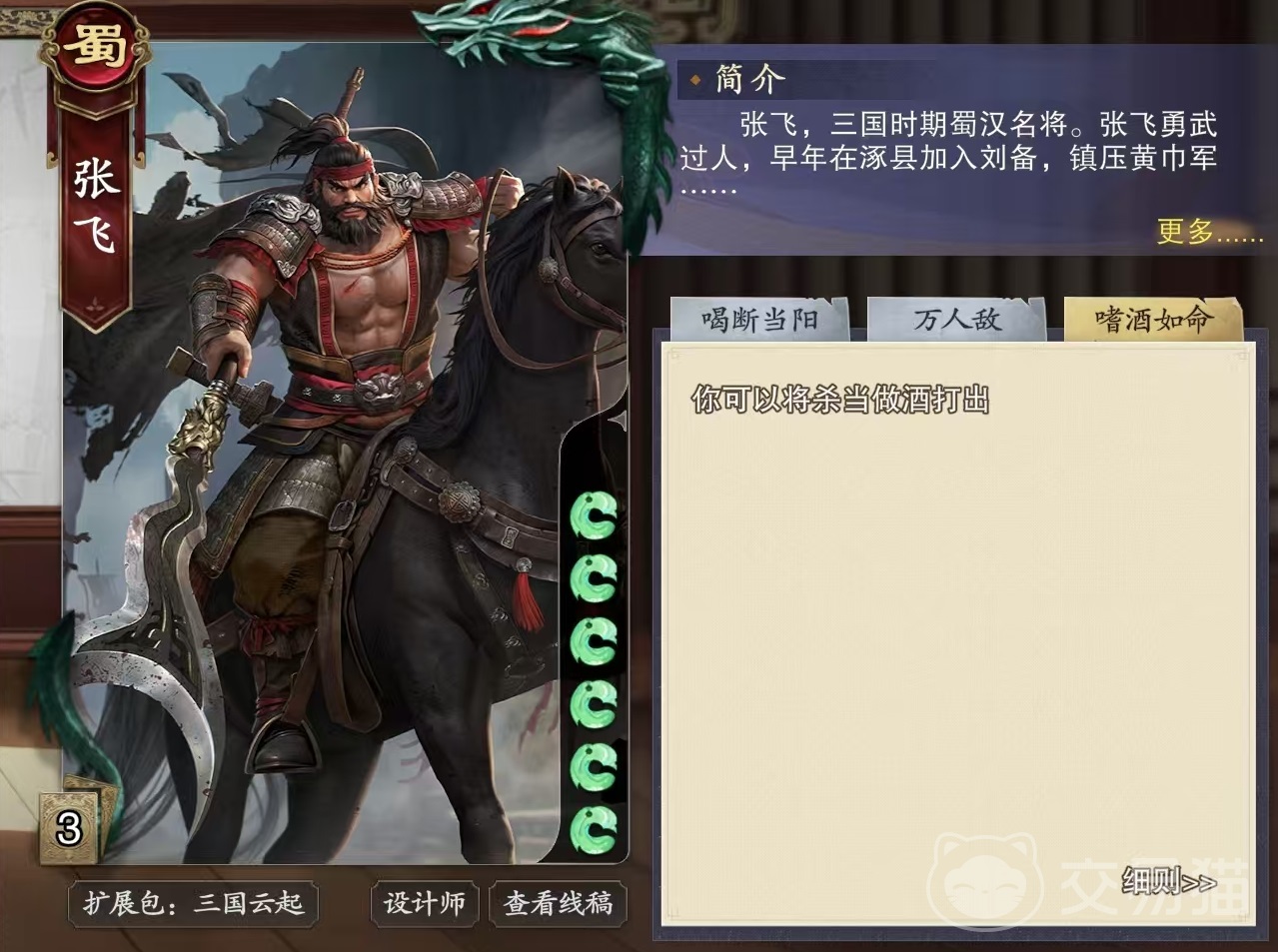 看完小编的这些介绍之后,大家就了解代号杀张飞怎么玩了吧,通过这些技能不难看出,张飞所拥有的都是被动技能,而且每一个都非常实用,这也是这张牌能拥有很高热度的原因,新手玩家非常推荐选择。