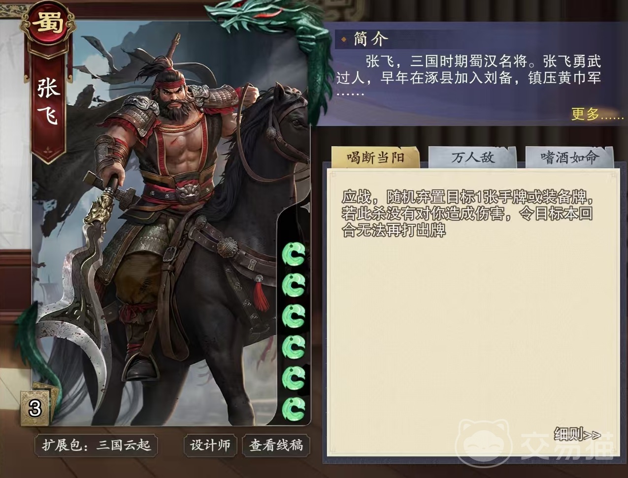张飞这张卡牌之所以受到大家的喜爱,是因为他拥有三个技能效果,大多数角色都是两个,这三个分别是喝断当阳、万人敌和嗜酒如命。这个技能效果是当张飞应战,也就是成为对方杀的目标时,会随机将目标一张手牌或者是装备牌弃置。如果此杀没有对张飞造成伤害,那么目标本回合无法再打出牌。这里要注意,无论是张飞使出了闪还是身上所穿的装备,例如藤甲等消除了杀的效果,这个状态都会触发。