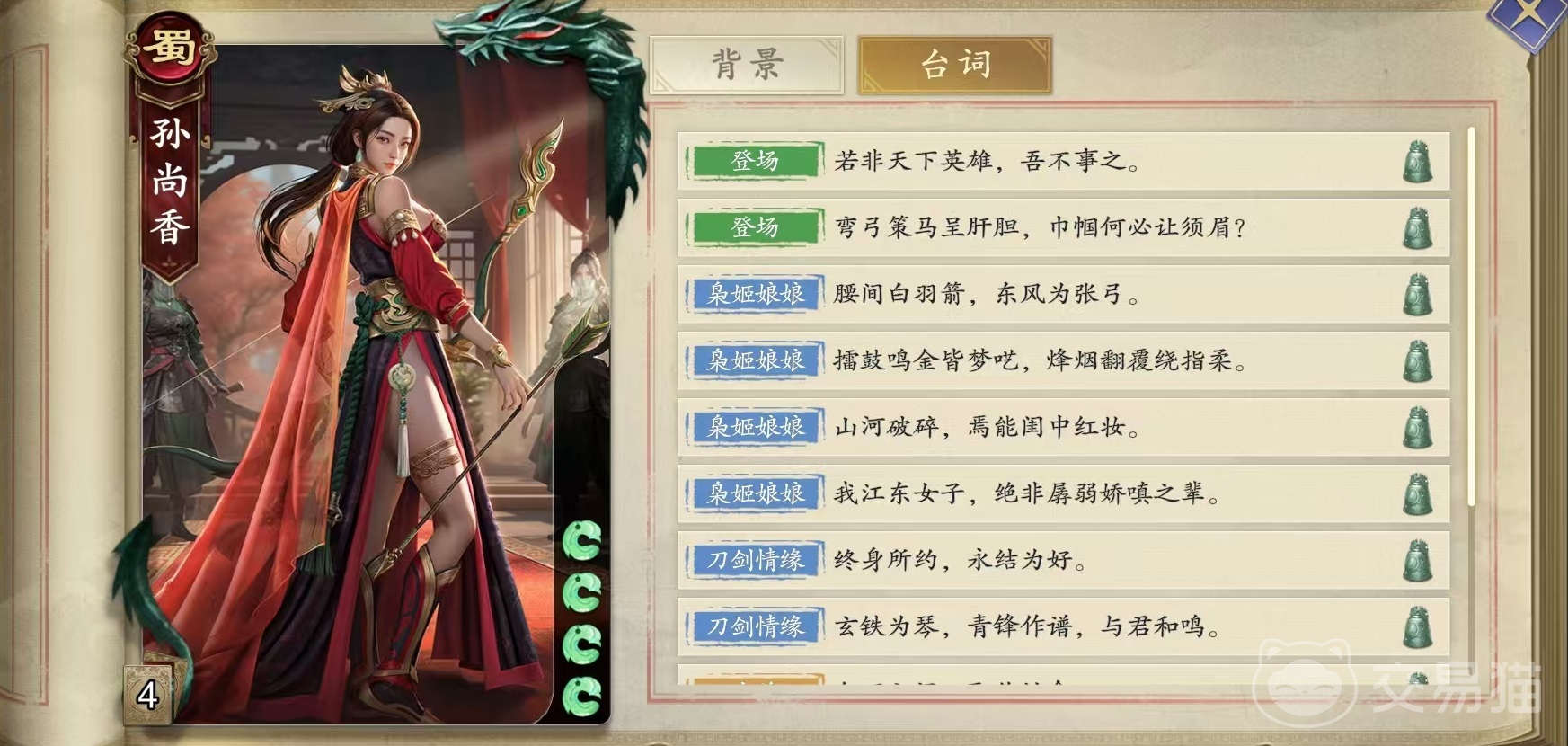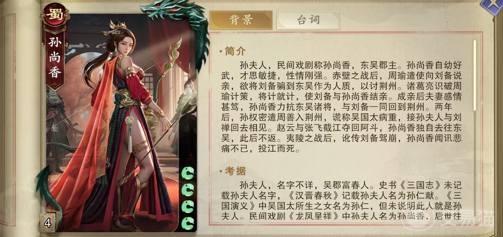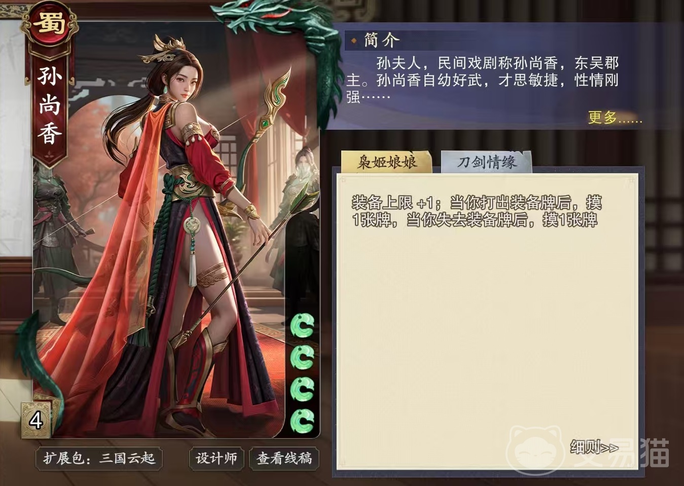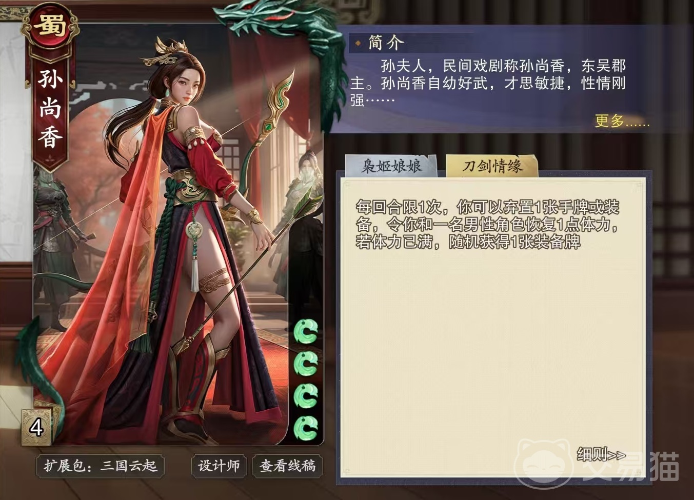 在这款游戏中,孙尚香被分配到了蜀国的阵营中,初始体力为4点,两个技能分别是枭姬娘娘和刀剑情缘。第1个枭姬娘娘的效果是装备上限加1,当打出装备牌后可以摸一张牌,当失去装备牌后也可以摸一张牌。第2个刀剑情缘,效果是每回合限制使用一次,可以选择弃置一张手牌或者是装备牌,然后用自身和另外一名男性角色恢复一点体力,如果此时体力已满,那么将随机获得一张装备牌。