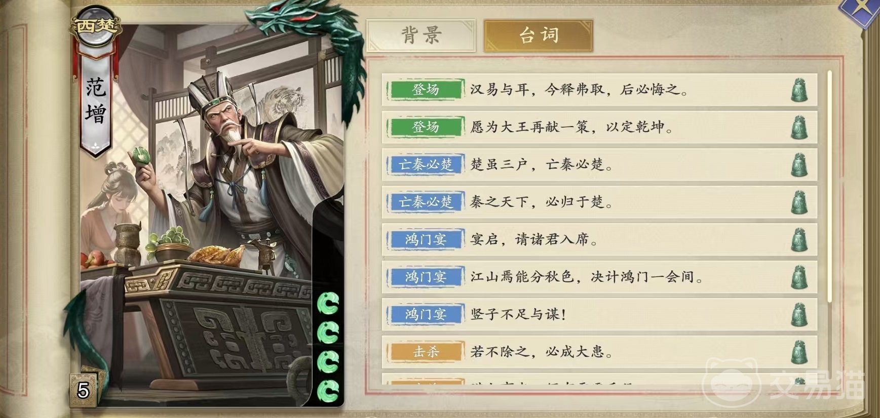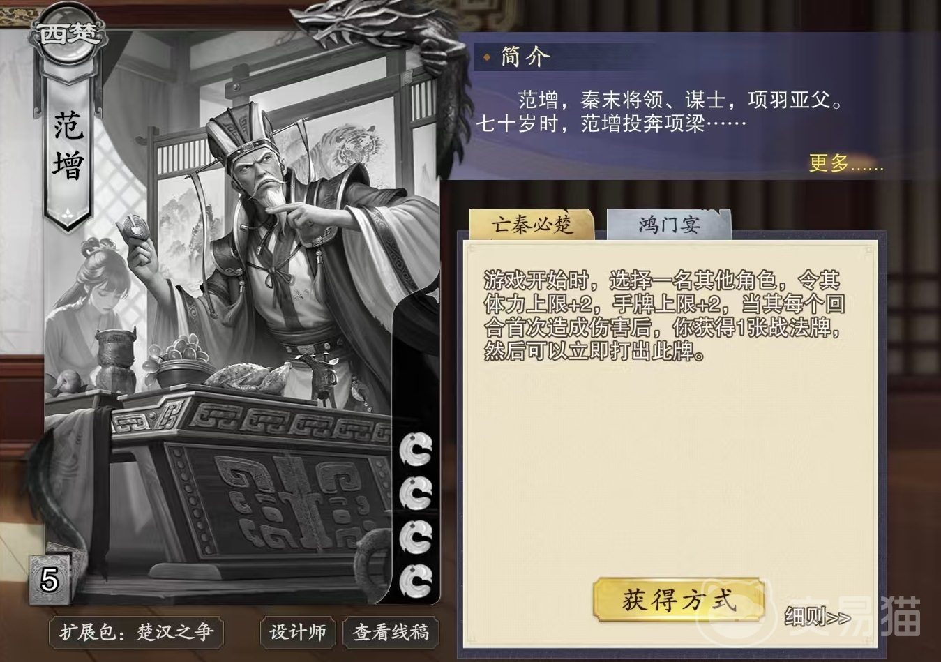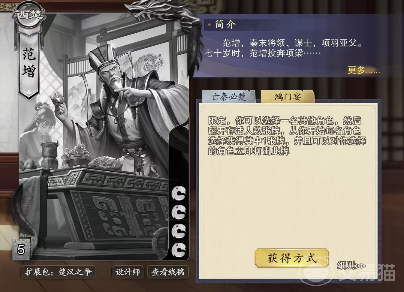 范增是属于西楚阵营的一名角色,他初始体力为4点,拥有的两个技能分别是亡秦必楚和鸿门宴。亡秦必楚的效果是在游戏开始时,可以选择一名其他角色,直接使其增加两点体力上限和两张手牌上限。当其每个回合首次造成伤害后,范增就可以获得一张战法牌,然后可以将这张牌立刻打出去。鸿门宴效果是可以选择一名其他角色,然后翻开存活人数的牌数,从自身开始每名角色选择获得其中的一张牌,并且可以对选择的角色立即打出此牌。当然鸿门宴是属于限定技能,只能发动一次。