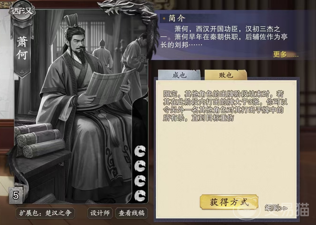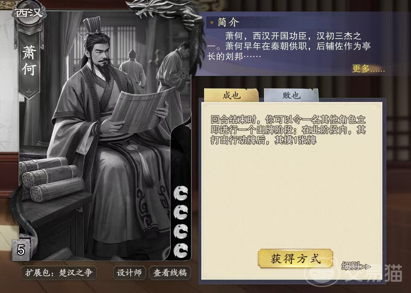 萧何初始具有4滴血,他的两个技能分别是成也和败也。成也的效果是在回合结束时可以另一名其他角色,立即进行一个出牌阶段,在此阶段内其打出行动牌后,可以摸一张牌。败也的效果是,其他角色出牌阶段结束时,如果其在此阶段内打出的牌大于三张,那么萧何就可以令另外一名其他角色,对其打出手牌中的所有杀,直到目标重伤。