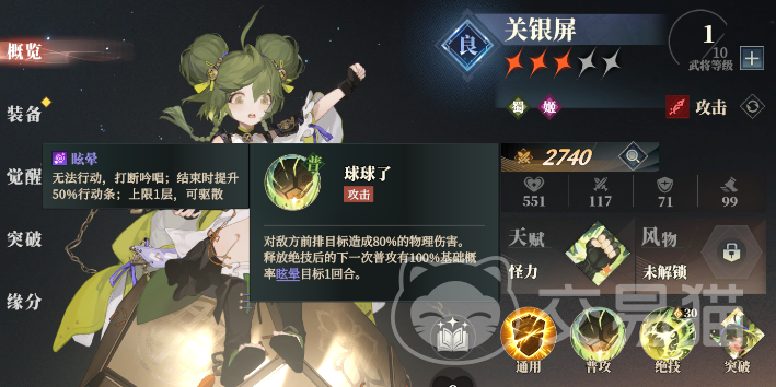第六人选择可以视情况而定,觉得队伍不稳就再摆上一个防御向的武将,比如【诸葛果】,没压力的话就再摆上输出型的,比如这里使用的关银屏。绝技群体高倍率物伤,但需要吟唱并且使用后速度降低50%,但是获得突破技后使用通用技获得buff就可以免吟唱同时免疫减速和控制。而且关键的是使用绝技后的下一次普攻可以眩晕目标。大招伤害稳定,有单点晕,是推图很好用,适合开荒的卡,而且也很容易抽到。