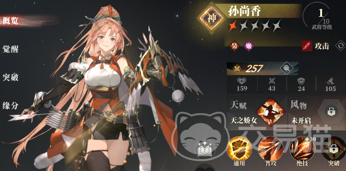 孙尚香本体就可以通过天赋获得多种buff增益,满buff下突破技更是提供速度和减益抗性加成。输出模组非常平滑的武将,单点伤害高,又有对一排敌人的群伤。阵容构筑就可以围绕她来补充增益、补刀以及承伤人选。