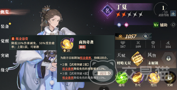 绝技可以给敌人添加“降低10%(15%)伤害减免”的buff,可以变相理解为一种易伤buff,此外还能降低目标50%的受治愈率,部分敌人有高回复的场合有奇效。天赋加持下队友对该debuff目标攻击时,丁夏也会对其造成间接伤害,突破技则是每造成3次直接或者间接伤害都会额外提升一定的增伤。丁夏是有伤害的辅助,通过削弱对方的伤害减免来提升整体队伍的伤害,自身的伤害也不低。