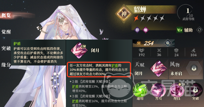 貂蝉则辅助型的武将,普攻不仅可以造成法术伤害也可以对百分比血量最少的队友添加护盾,绝技群体生命上限11%(13%)的护盾,同时还附加1层10%的穿防,而且队友在攻击的时候还可以消耗护盾值的10%(16%)来提升攻击力,算是充分利用有时候会溢出的护盾了。貂蝉的突破技还可以降低绝技释放的能耗,本身能耗就只有20点,超低的能耗可以让给队友提供源源不断的护盾与穿防。双盾加持下的女团不仅有很高的生存,更是可以依赖护盾值转化攻击来打出爆发伤害。