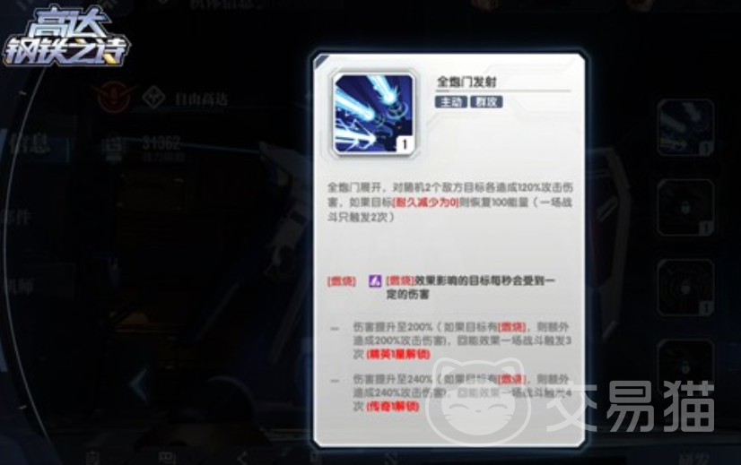 角色还有一项技能,就是可以提升自身机甲的攻击速度,在战斗的过程,角色能用自身的粒子炮粒子炮,对对手展开凶猛的火力攻击,对方在受到一定伤害之后还会叠加燃烧状态,这种燃烧状态能让对方持续10秒钟的攻击伤害,每秒都能带来15%的伤害,可以借助角色的这项技能在战斗的时候稳定输出。