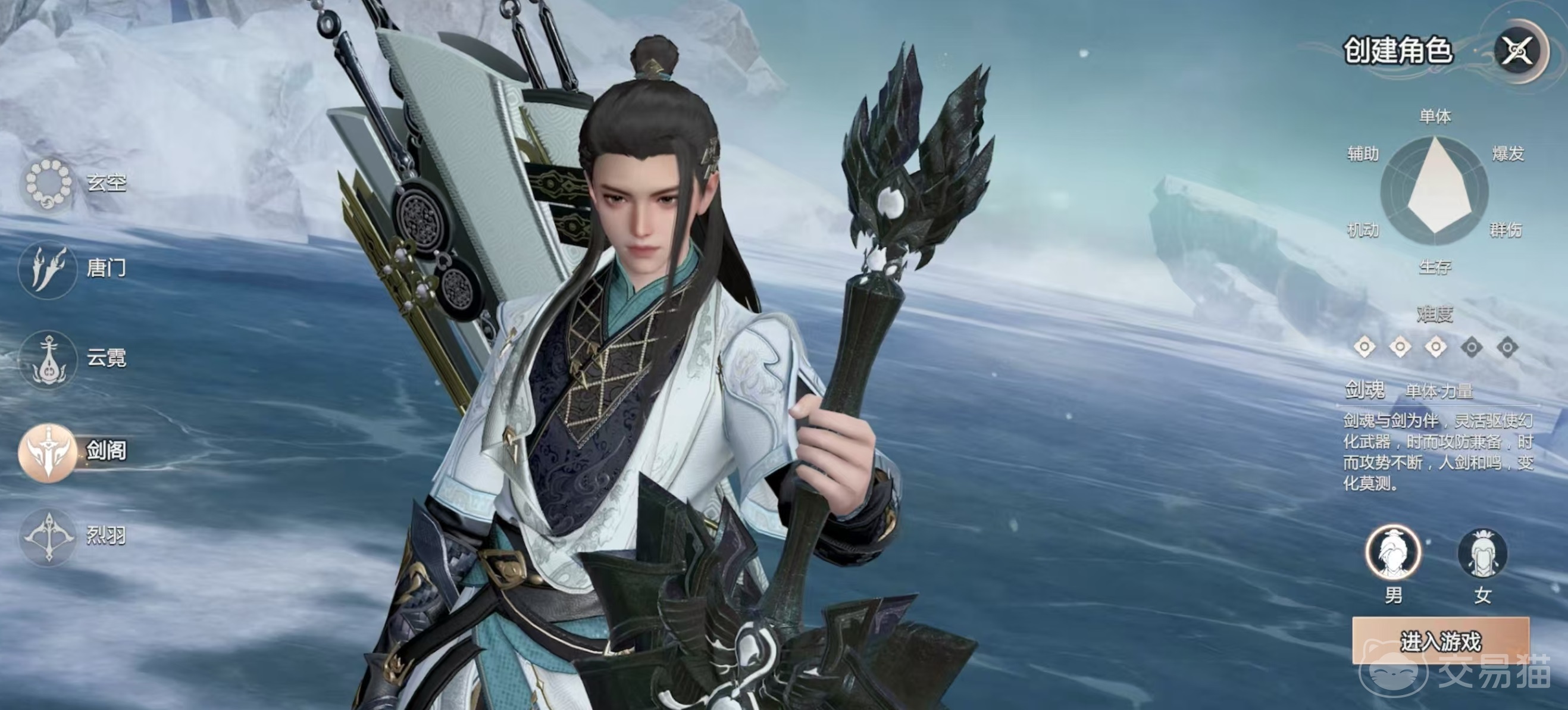 剑阁传说是由上古剑仙随手劈山而形成的平台之上开宗立派,门中弟子都怀着对剑道的炙热之心,在霜雪、雷电和剑气交织的天地间练剑,是举世无双的用剑宗门。在游戏中,剑阁的定位是近战外攻型门派,拥有强大的近战输出能力,特点是既有单体输出又能保证生存能力,还有一定的群伤能力,在战斗中通过攻击可以不断积攒真气,招式方面变化多端,非常凌厉。