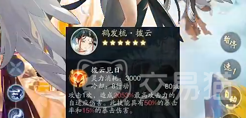 首先它的第一个能力叫做拨云见,使用一次需要消耗3000能量,也需要8次行动才能够冷却好。所以我们最好尽量在对方最薄弱时再使用,争取打出最高爆发。用了之后可以攻击一次,也造成高达2000%攻击力的爆发伤害。且具备着50%的暴击率以及15%的暴击伤害加成。