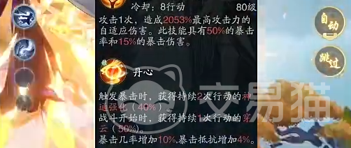 另外在战斗开始时,可以获得一次行动的穿云,也就是增加自己的穿透伤害。另外还可以让你的暴击率增加10%,并且获得4%的暴击抵抗力。如此一来,你不仅能够更快的打出高额爆发伤害,而且自身还带有一定的坦度,可以避免瞬间被对方击杀。