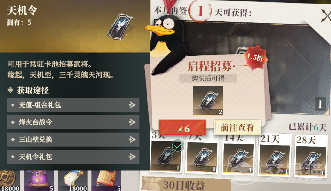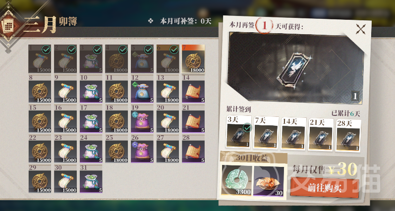 从主界面右上角按钮中可以找到“卯簿”的入口,进去之后就可以看到当前的卯簿,每个月的奖励大同小异。主要是兵法(武将升级经验)、进阶材料自选箱、三山钱(基础货币)、觉醒自选材料。