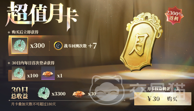 月卡可以叠加购买使用,不过最多不能叠加超过180点。除了立刻得到的300三山壁还有需要玩家每天上线登陆领取的,除了这些奖励,还有一个功能就是可以提升7次战斗回溯,长线高难的战斗,这个功能还是蛮好用的。