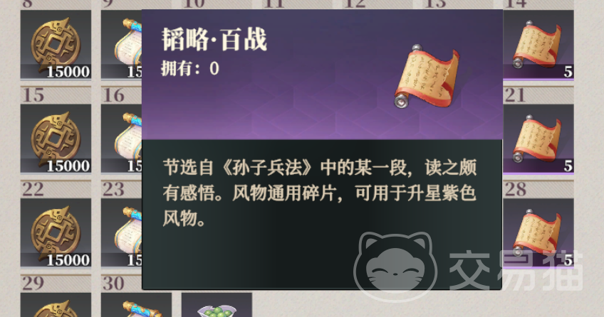 在每个月的14、21、28日还能签到获得韬略·百战,风物通用的碎片,可以用来给紫色风物升星。除了基础的签到奖励外,还有连续签到奖励,连续3/7/14/21/28天则可以分别得到1个常驻抽,合计5个。