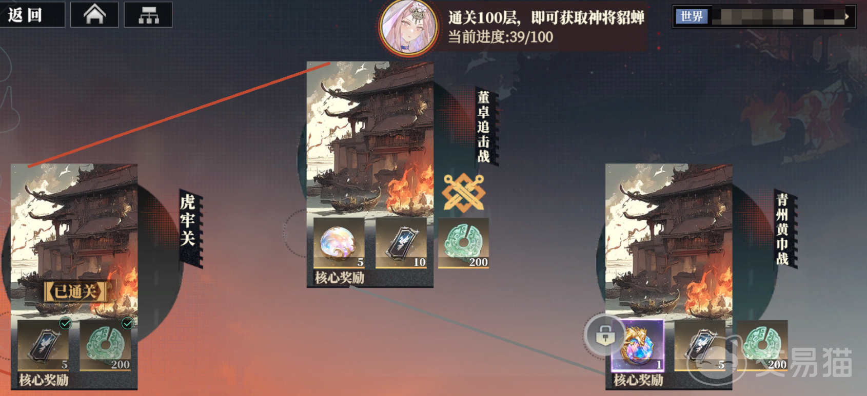 烽火台,某种意义上可以理解为爬塔,从颍川之战到青州黄巾战,难度逐步提升,主要奖励是常驻抽、三山壁以及各种养成材料,通常每一大关的关底难度较高。通关100层的话可以获取神将貂蝉。