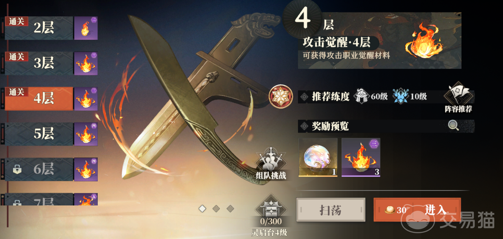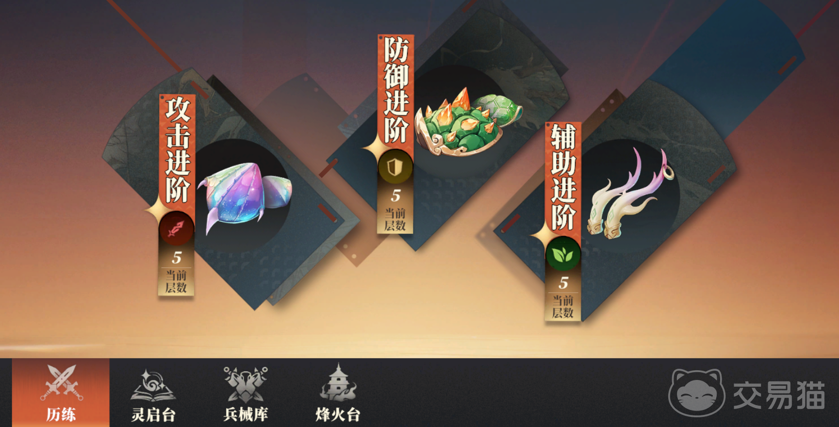 试炼包含:历练、灵启台、兵械库、烽火台。先来说历练,分为攻击进阶、防御进阶、辅助进阶,每个都有9层,可以产出对应类型武将的进阶材料。首通的时候是不消耗精力的,只有通过当前关,并解锁前置条件才可以打下一关。