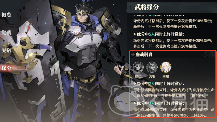关于三国志幻想大陆2枭之歌t0最强阵容的分享就到这里,只是给大家提供了一些思路,围绕这个思路与核心武将来构建阵容就可以了,注意加成收益大的天赋和突破优先点,然后就是一些职业的选择以及技能释放先后顺序,这个则要具体情况具体应对了。