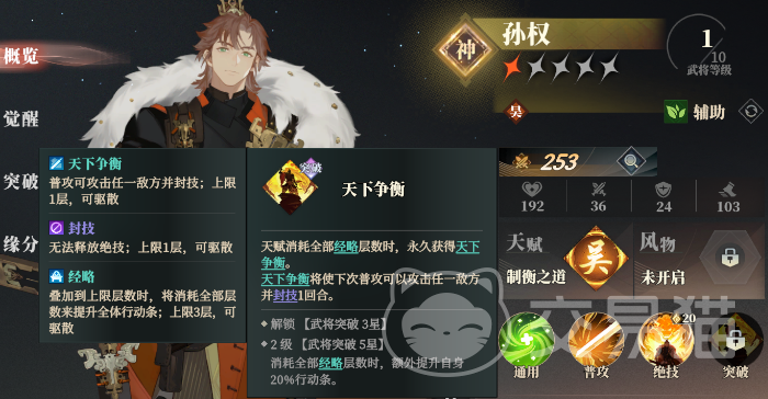 而这套阵容里的核心辅助推荐采用的孙权和步练师的组合,孙权绝技可以指定队友提速外加能耗降低30点。孙权优先将天赋升到2级解锁提升己方行动条所需经略的层数,然后是解锁突破技“天下争霸”,消耗全部层数来获得天下争霸的效果使得下次普攻可以封印敌方的技能,回合制游戏里“封”的重要性无需多言。