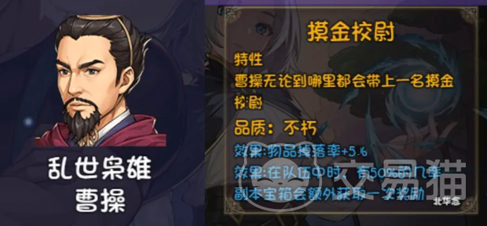 他的特性是无论到哪里都会带上一位摸金校尉,被动效果是自己在队伍中时有一半概率副本宝箱会额外获取一次奖励,再加上他作为法师前期的伤害也很不错,需要的黑暗系装备是所有法师里面最好获取的,有异土的情况下附加伤害很多,建议新手获取培养,优先点他的连击率的天赋。