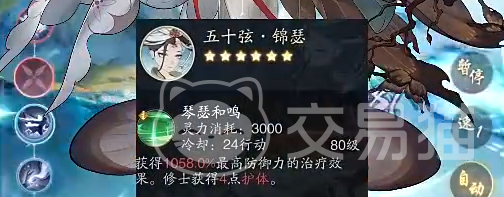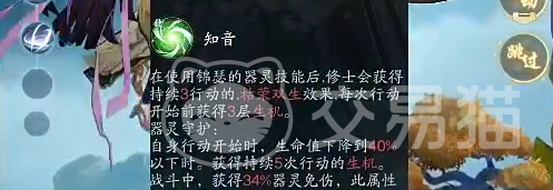 在他的器灵技能叫做知音,当他成功用出这个技能之后,修饰就可以获得三个回合行动的特殊效果,叫做枯荣双生。每次行动之前就可以为自己叠加三层生机,当自己开始行动之后,如果生命值下降到40%的话。