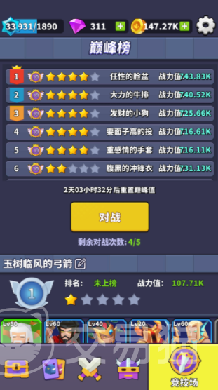 另外在游戏里还有巅峰榜的玩法,所有成员都可以在巅峰榜中不断战斗,证明自身的能力,每一局战斗都会有相应的战力值呈现,玩家在三天之内有5次参与对战的机会,会根据实际的战力数值呈现在榜单上,想证明自己能力的,可以加入到巅峰榜对抗中,利用各种不同的英雄能力,辅助自己参与对抗。
