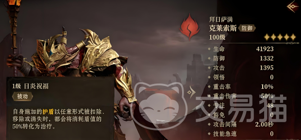 拜日萨满·克莱索斯是火焰元素的防御英雄,生命值超过了四万点。同时,他在攻击与防御两端均展现出了不俗的实力,各自突破了一千的门槛。作为队长时,他独有的“防御光环”技能,在探险的征途中能为队伍中的每一位成员增添45%的防御加成,让他们更加坚不可摧。“日炎祝福”的被动,则巧妙地利用自身施放的护盾,在护盾因任何原因被削减和移除或自然消散之际,将部分护盾能量转化为治疗力量,为队伍带来持续的状态恢复,有效增强了全队的持久作战能力。