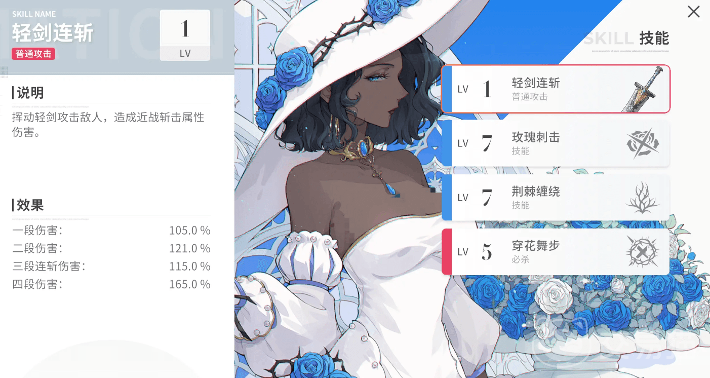 芙使用双手剑作为武器,总共有4段普攻,最后一段伤害最高,由于是双手剑的关系,普攻的前后摇都比较长,所以掌握好时机释放重要,她的“玫瑰刺击”会在目标的位置生成巨大的蓝色玫瑰,然后突刺斩碎,对玫瑰周围的敌人形成近战斩击伤害,如果剑刃触及目标,玫瑰破碎时还会向四周额外释放尖刺造成二次伤害;