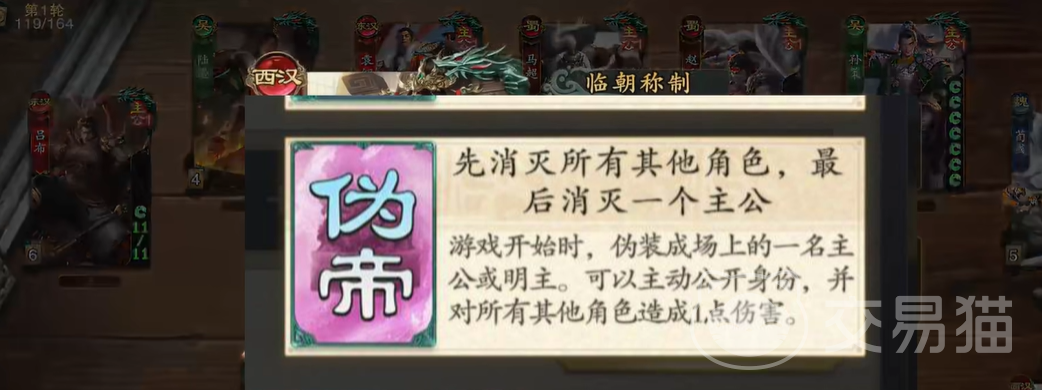 伪帝的身份其实算是比较难获得游戏胜利的条件,因为这个身份的获胜条件有些麻烦,他几乎没有任何的盟友,需要将场上所有人的杀光才能胜利,同时主公必须要留到最后,中途一旦主公杀死,那么伪帝的身份就会立即失败。