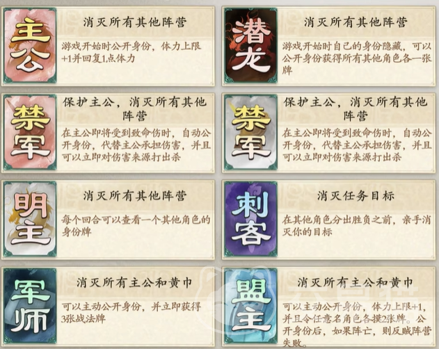 不同身份之间虽然名字不一样,但是部分是可以组成一个阵营的,比如说经典的主公阵容,这个身份的优势在于增加一点血量,而只依靠主公一人去消灭其他人是非常困难的,所以就会有禁军的身份,这个身份的获胜条件就是跟随主公一起杀掉其他人。