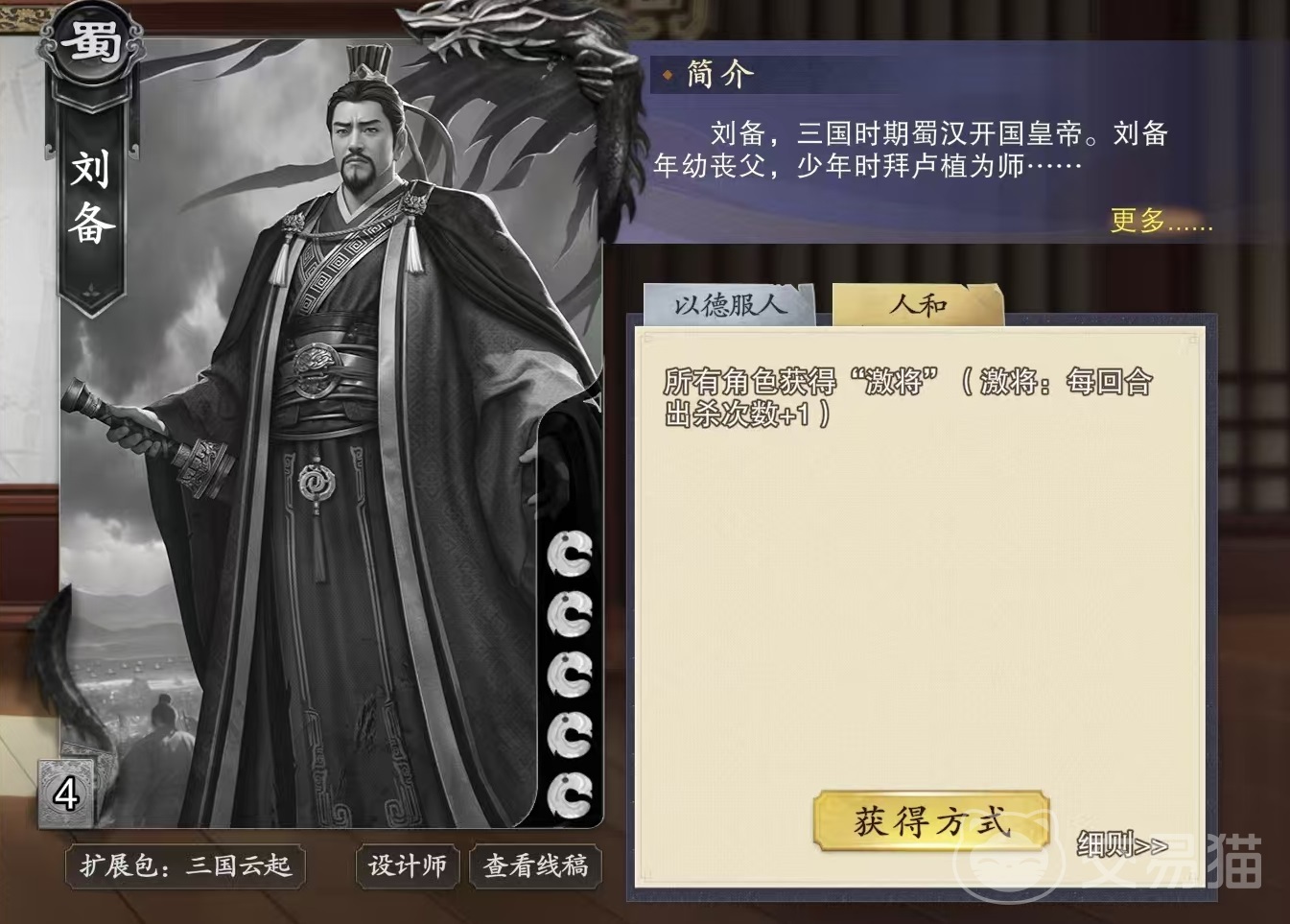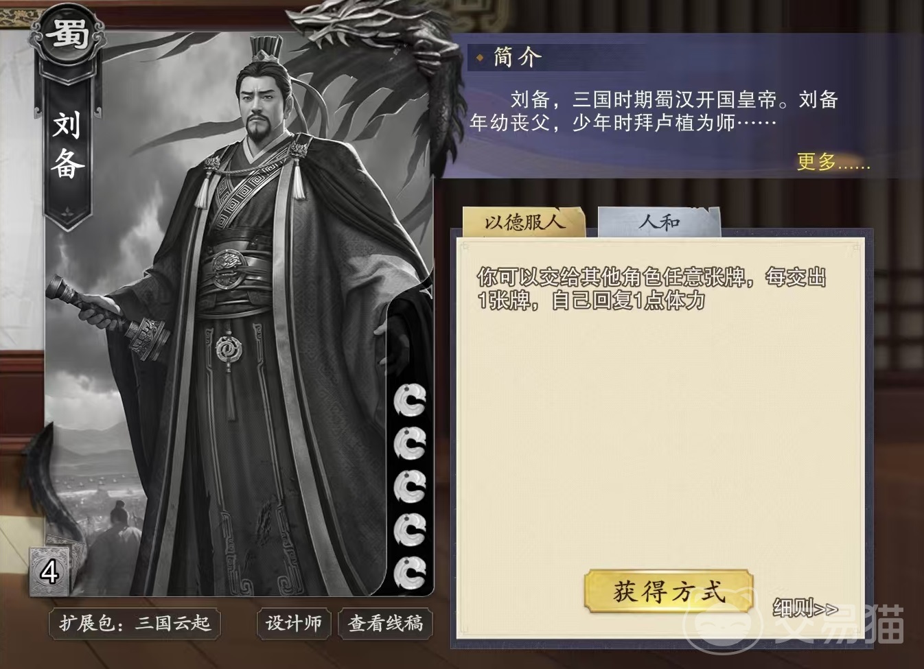 刘备这张牌技能还是比较简单的,只有两个,以德服人和仁和。以德服人的效果是可以给任意角色交给任意张牌,每交出一张牌,自身就能恢复一点体力。仁和的效果是所有角色获得激将效果,激将让每回合出杀次数加1。很简单的技能,而且使用起来有非常有针对性,例如以德服人这个技能,在出牌阶段是可以发动多次,理论上只要有手牌就有无限制体力。例如自身拥有5点血量,那么一旦在第一回合受到集火攻击,第二回合就可以直接将牌全部给出去,这样将手牌打光,然后将体力补满。