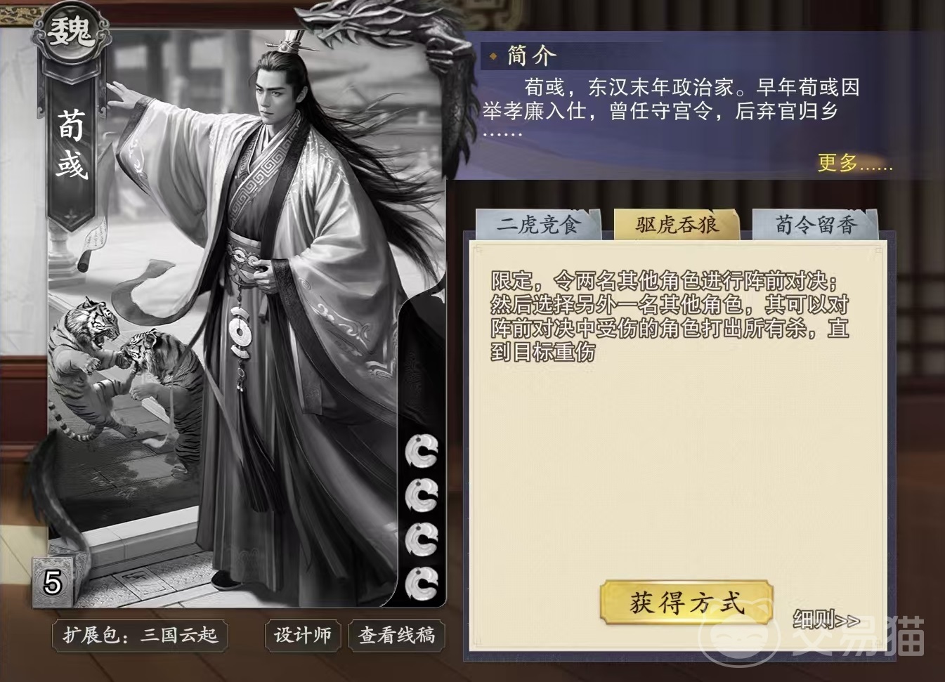 第2个技能驱狼吞虎,并不需要阵前对决这张牌,只是执行阵前对决的效果,打出手牌中所有的杀,结算规则和诸葛连弩相同,确认后自动将手牌中所有的杀全部打出。最后一个技能荀令留香,当然是给自己阵营的角色使用了,尤其是作为忠臣时直接可以给主公送牌,所以也是一个比较考验玩家之间配合的技能,一定要选对目标。