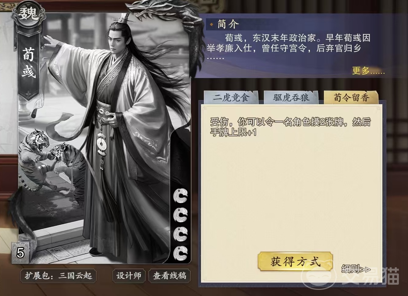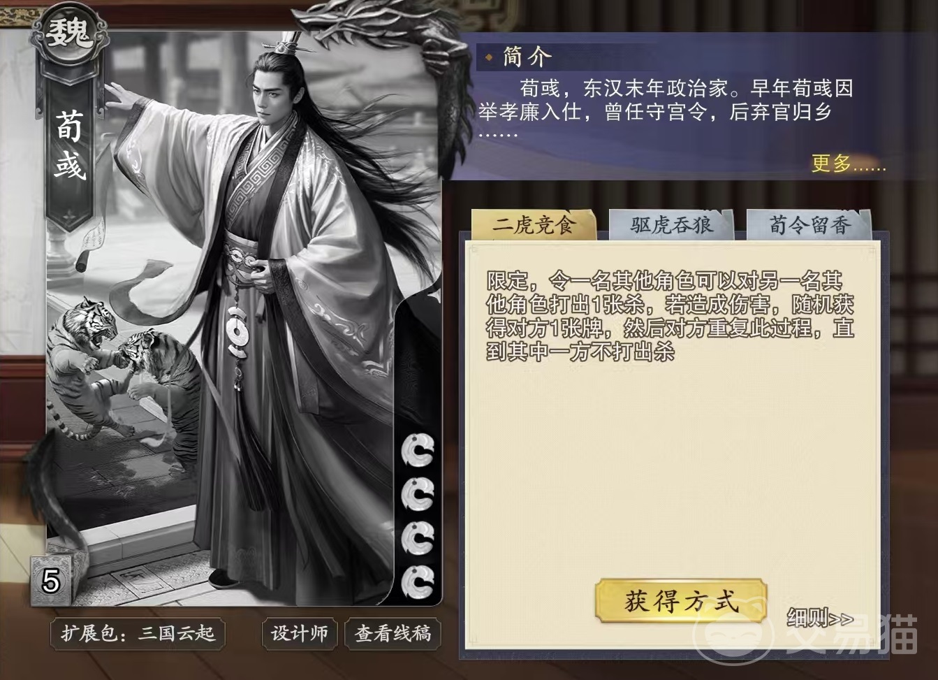 作为只有四滴血的荀彧,他的三个技能比其他的武将两个技能要多出一个,三个技能分别是二虎竞食,驱狼吞虎和荀令留香。二虎竞食是属于限定技,可另一名其他角色对另一名其他角色打出一张杀,如果此杀造成伤害,那么随机获得对方一张牌,然后对方重复此过程,直到其中一方打不出杀为止。驱狼吞虎也是限定技,令两名其他角色进行阵前对决,然后选择另一名其他角色,其可以对阵前对决中受伤的角色打出所有杀,直到目标重伤。