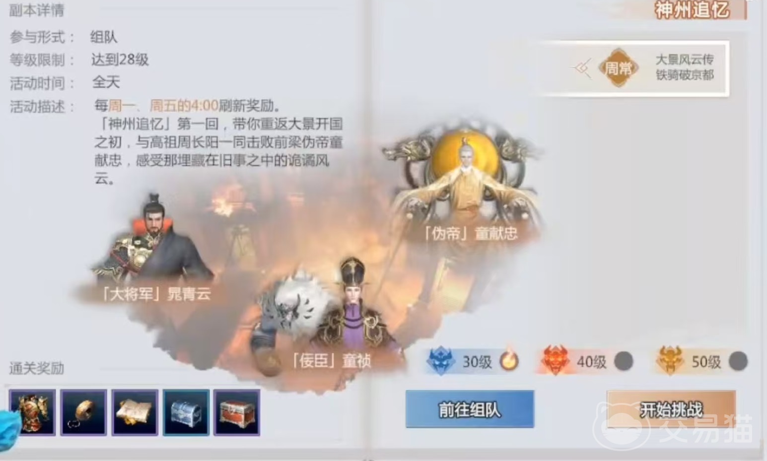 在战斗中一共有三个boss需要去击杀,分别是大将军晁青云、佞臣童祯和伪帝童献忠,每个boss都可以给予奖励,主要包括本职业的紫色装备等。这个活动也分为不同的级别,从30级开始到40级、50级,每一个级别所面临的挑战也是不一样的,需要从最低级开始逐个往上进行战斗。在活动界面中可以看到有前往组队和开始挑战这两类,如果大家没有合适的队伍,就去前往组队,这里可以自己建一个队伍,也可以加入其他人的队伍中。等到队伍人数满了之后,点击开始挑战就可以加入进活动中了。