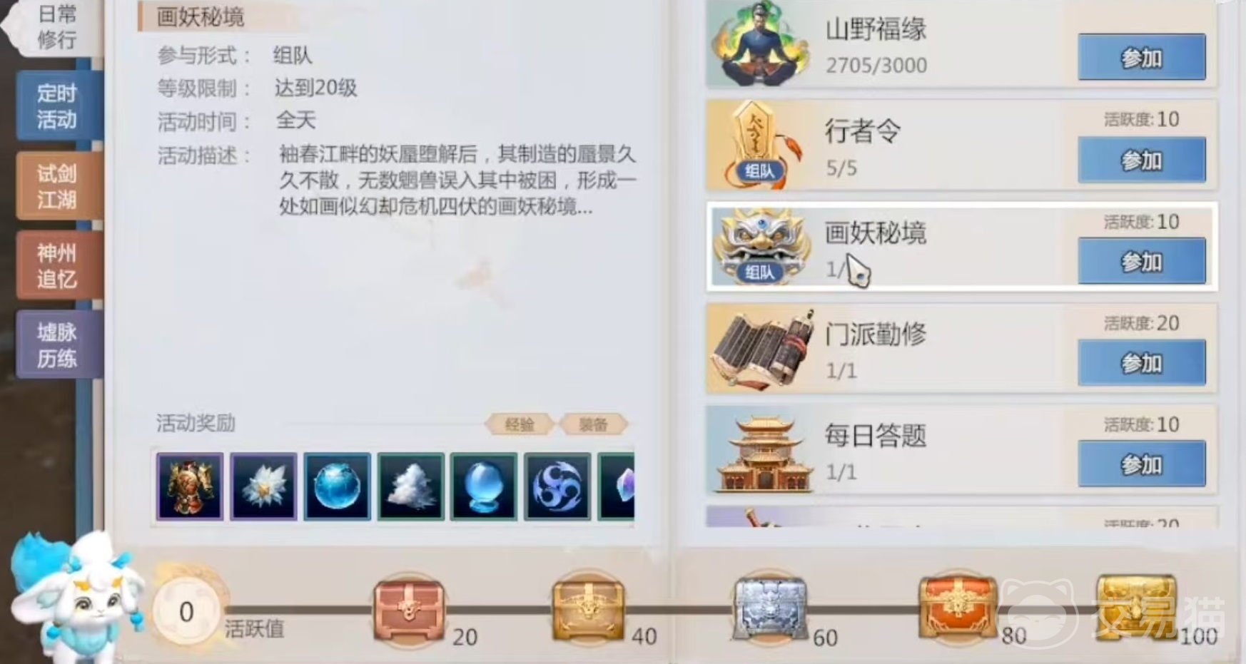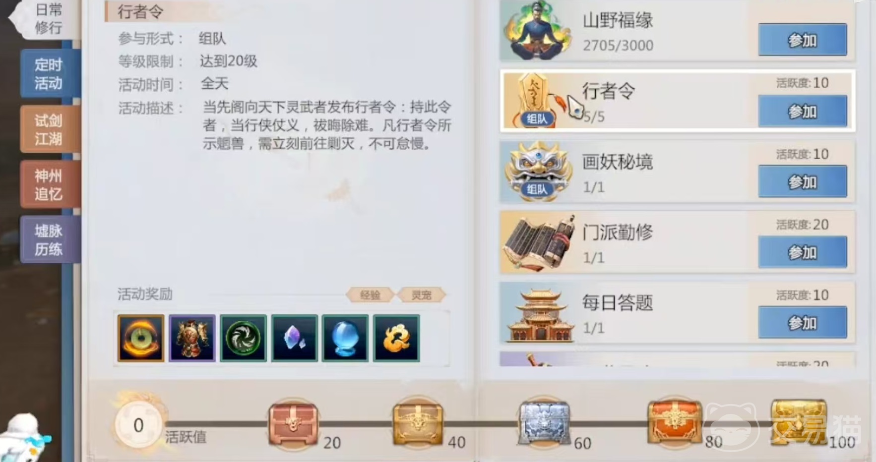 行者令也是20级就可以参加,需要组队的形式参与,内容主要是和各种怪物进行战斗,奖励经验装备等道具,每天可以完成5次,奖励10点活跃度每次。画妖秘境也是组队的形式,每天可以完成一次,给予10点活跃度,完成之后有机会获得息玉,使用后随机获得一只灵宠。门派行修是单人活动,主要是回自己的门派出完成任务,给予20点活跃度。每日答题只需要15级就可以加入进来,只需要完成几个很简单的题目就能拿到奖励。