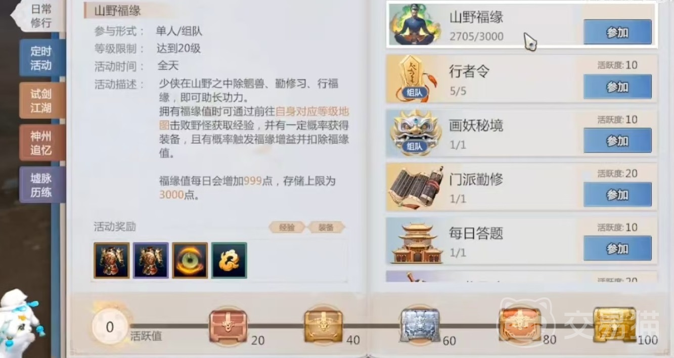 点开日常修行之后就可以看到有多种不同的每日任务,主要包括山野福缘、行者令、画妖秘境、门派勤修、每日答题等。其中山野福缘是属于单人和组队都可以参加的活动,达到20级就可以加入进来,拥有福缘值时可以通过前往自身对应等级地图击败野怪获取经验,还有一定几率获得装备,还有概率触发福缘增益,并扣除福缘。福缘值每天会增加999点,储存上限为3000点,因为有上限,所以一定要及时用掉,不要浪费。