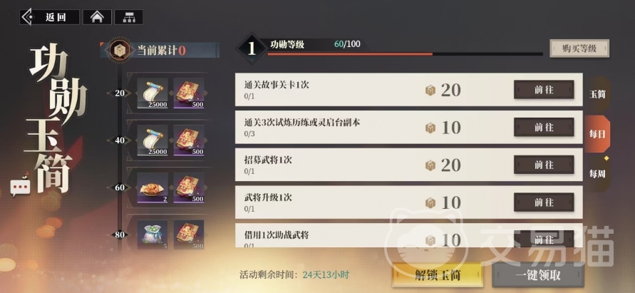 很多玩家可能对这个玉简系统的具体功能和作用还不太清楚,其实它有点类似于其他游戏中常见的战令系统,在游戏主界面左下角的目录中,大家可以找到玉简选项,进入这个系统,首先上面大家可以看到,玩家通过完成每日任务和每周任务,都能够获得功勋值,每日任务丰富多样,涵盖了游戏中的各种玩法和活动,比如完成特定的副本挑战、参与竞技场对战、收集指定的资源等等。